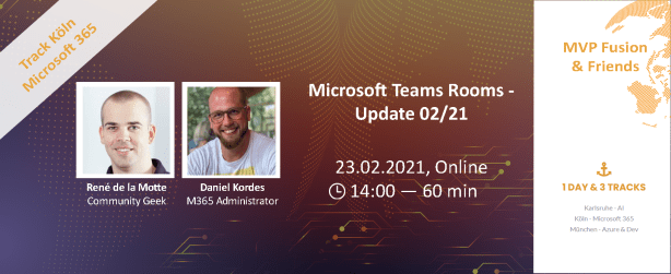 Am 23.02.2021 findet die MVP Fusion 2021 statt. In drei Tracks verteilt werden Vorträge in den Themenbereichen AI, Microsoft 365 und Dev angeboten. Zusammen mit Daniel freue ich mich um 14 Uhr einen Überblick über Microsoft Teams Rooms geben zu dürfen. Wir beginnen mit einem Rückblick über die Neuerungen der letzten Zeit und schauen uns an welche Neuigkeiten kurz vor dem Release stehen.