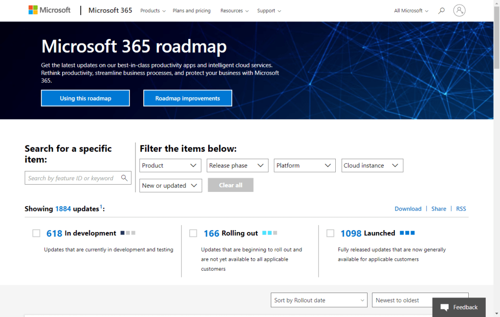 Die Microsoft 365 Roadmap ist für jeden frei verfügbar einsehbar. Sie stellt die Pläne für Microsoft 365 in den nächsten Monaten dar. Stand 10.01.24 waren es 1884 Einträge, das ist doch schon ganz ordentlich. Die Einträge lassen sich nach Produkt, Release Phase, Plattform oder Cloud Instance sortieren. Weiterhin ist es möglich nur auf Einträge in Entwicklung, im Rollout oder fertig verfügbare Funktionen zu filtern.